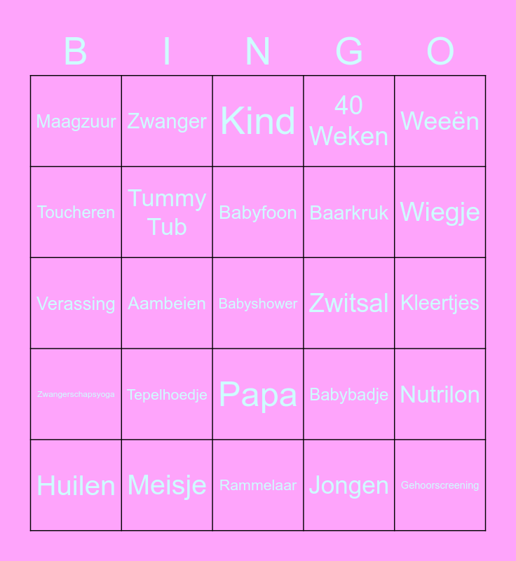 This bingo card has a free space and 64 words: Luier, Spuitluiers, Flesje, Nutrilon, Babymassage, Buik, Zwanger, Verloskundige, Babyfoon, Mama, Papa, Speelgoed, Kleertjes, Weeën, Ontsluiting, Toucheren, Aambeien, Maagzuur, Hormonen, Baarkruk, Tepelhoedje, Zwangerschapsyoga, 40 Weken, 9 Maanden, Baby, Fopspeen, Flesvoeding, Roze, Beschuit met muisjes, Borstvoeding, Blauw, Rompertje, Kraamzorg, babykamer, Wiegje, Huilen, Kraamvisite, Jongen, Echo, Tummy Tub, Verassing, Zwitsal, Slapenloze nachten, Hielprik, Hydrofiele Luier, Gehoorscreening, Meisje, Naïf, Babybadje, Brabbelen, Geluidjes, Geen Seks, Rammelaar, Namen, Melk, Slingers, Kind, Geboorte, Leven, Luiertas, Kinderwagen, Maxi-Cosi, Eerste woordje and Box.