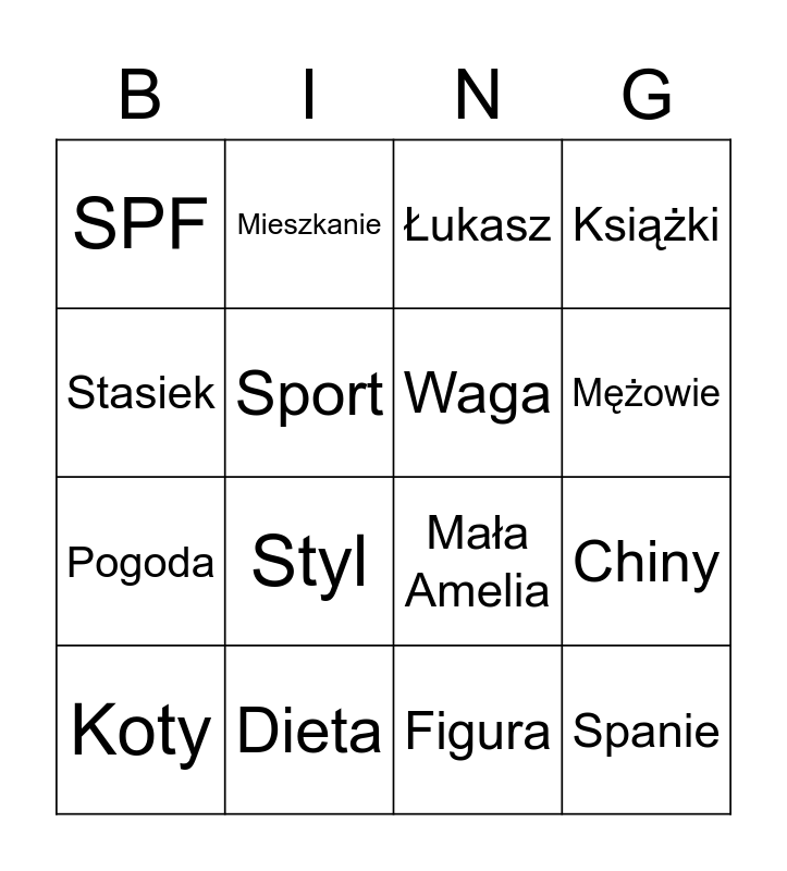 This bingo card has 16 words: Dieta, Chiny, Łukasz, SPF, Pogoda, Mieszkanie, Mała Amelia, Figura, Stasiek, Sport, Koty, Książki, Styl, Mężowie, Waga and Spanie.