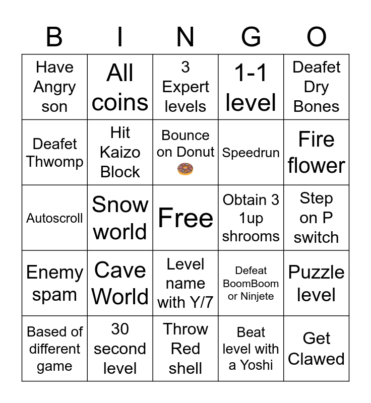 This bingo card has a free space and 24 words: Cave World, 30 second level, Bounce on Donut 🍩, Based of different game, Deafet Dry Bones, Have Angry son, Deafet Thwomp, All coins, Obtain 3 1up shrooms, Level name with Y/7, Speedrun, Autoscroll, Defeat BoomBoom or Ninjete, Puzzle level, Hit Kaizo Block, Beat level with a Yoshi, Step on P switch, 3 Expert levels, Fire flower, Snow world, Get Clawed, Enemy spam, 1-1 level and Throw Red shell.