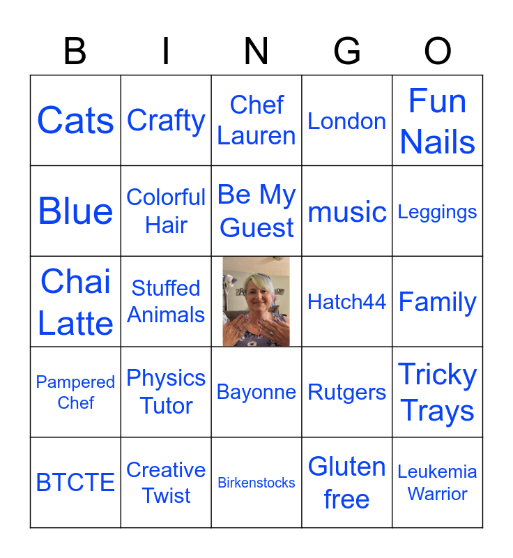 This bingo card has a free space and 26 words: Bayonne, Gluten free, Be My Guest, Creative Twist, Fun Nails, Cats, Blue, Crafty, Family, Rutgers, music, Chai Latte, Tricky Trays, BTCTE, Stuffed Animals, PTO, London, Pampered Chef, Chef Lauren, Leukemia Warrior, Leggings, Birkenstocks, Hatch44, Physics Tutor, Colorful Hair and LBI.