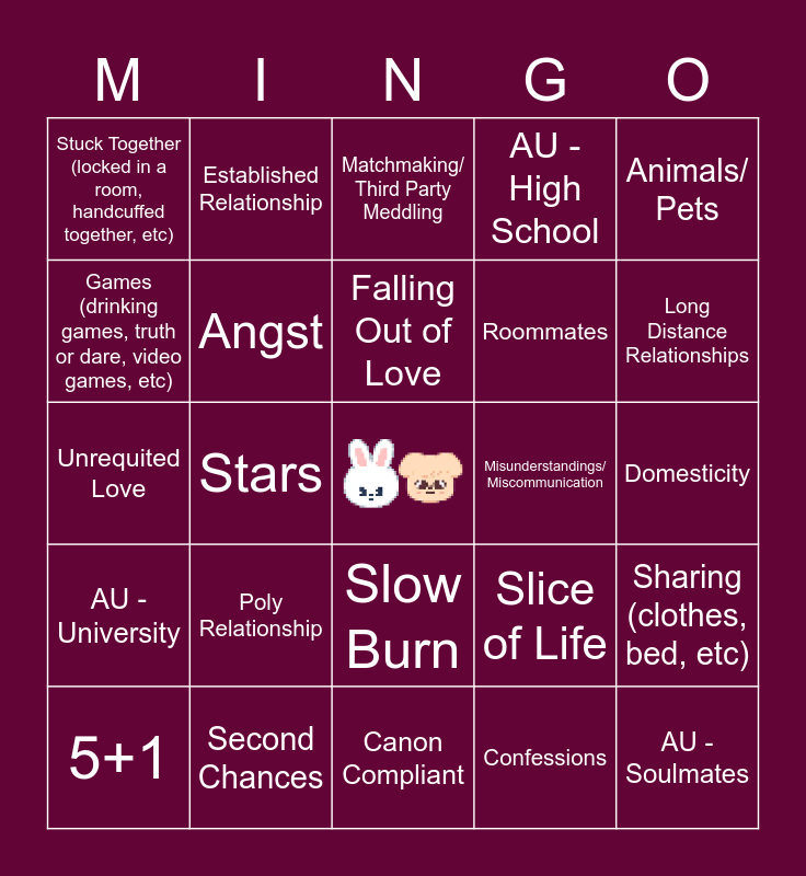 This bingo card has a free space and 24 words: Poly Relationship, Second Chances, Falling Out of Love, 5+1, Animals/ Pets, Stuck Together (locked in a room, handcuffed together, etc), Games (drinking games, truth or dare, video games, etc), Established Relationship, Misunderstandings/ Miscommunication, Slow Burn, Roommates, Unrequited Love, Slice of Life, Sharing (clothes, bed, etc), Angst, Confessions, Domesticity, Matchmaking/ Third Party Meddling, Long Distance Relationships, Stars, AU - Soulmates, AU - University, AU - High School and Canon Compliant.