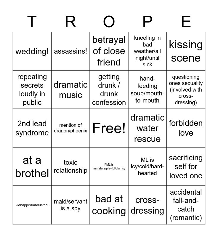 This bingo card has a free space and 34 words: fake mustache, cross-dressing, fake instrument playing, dancing/dancers scene, at a brothel, dramatic music, kissing scene, kidnapped/abducted!, assassins!, prison/torture, getting drunk / drunk confession, betrayal of close friend, overbearing mother, parent(s) died tragically, dramatic water rescue, questioning ones sexuality (involved with cross-dressing), maid/servant is a spy, 2nd lead syndrome, toxic relationship, ML is icy/cold/hard-hearted, FML is immature/playful/clumsy, innocent character dies, wedding!, forbidden love, bad at cooking, accidental fall-and-catch (romantic), kneeling in bad weather/all night/until sick, nursing another character back to health, hand-feeding soup/mouth-to-mouth, repeating secrets loudly in public, evil eunuch, mention of dragon/phoenix, sacrificing self for loved one and "let me go!".
