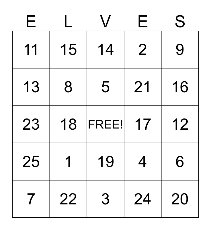This bingo card has a free space and 25 words: 1, 3, 5, 7, 9, 11, 13, 15, 17, 19, 21, 23, 4, 6, 8, 10, 12, 14, 16, 18, 20, 22, 25, 2 and 24.