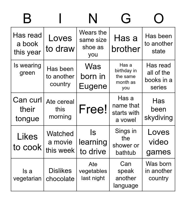 This bingo card has a free space and 49 words: Has a pet, Was born in another country, Lives with more than 3 people, Ate vegetables last night, Watched a movie this week, Has a sister, Loves to draw, Is allergic to cats, Is wearing green, Speaks another language, Has been to another country, Has a brother, Loves video games, Sings in the shower or bathtub, Plays an instrument, Loves to play sports, Was born in Eugene, Has a name that starts with a vowel, Can whistle, Has been to another state, Ate cereal this morning, Can speak another language, Has read a book this year, Has a birthday in the same month as you, Is the youngest child, Has read all of the books in a series, Is a vegetarian, Is a twin or triplet, Is learning to drive, Likes to cook, Is the oldest child, Is left-handed, Has been in a play, Has eaten escargot (snails), Dislikes chocolate, Is taller than a parent, Has broken a bone, Knows how to ice skate, Has been skydiving, Has their toenails painted, Has been on a train, Enjoys math, Went to a National Park this summer, Doesn't have pierced ears, Can curl their tongue, Wears the same size shoe as you, Doesn't use social media, Flosses their teeth every day and Can name all 7 dwarves.