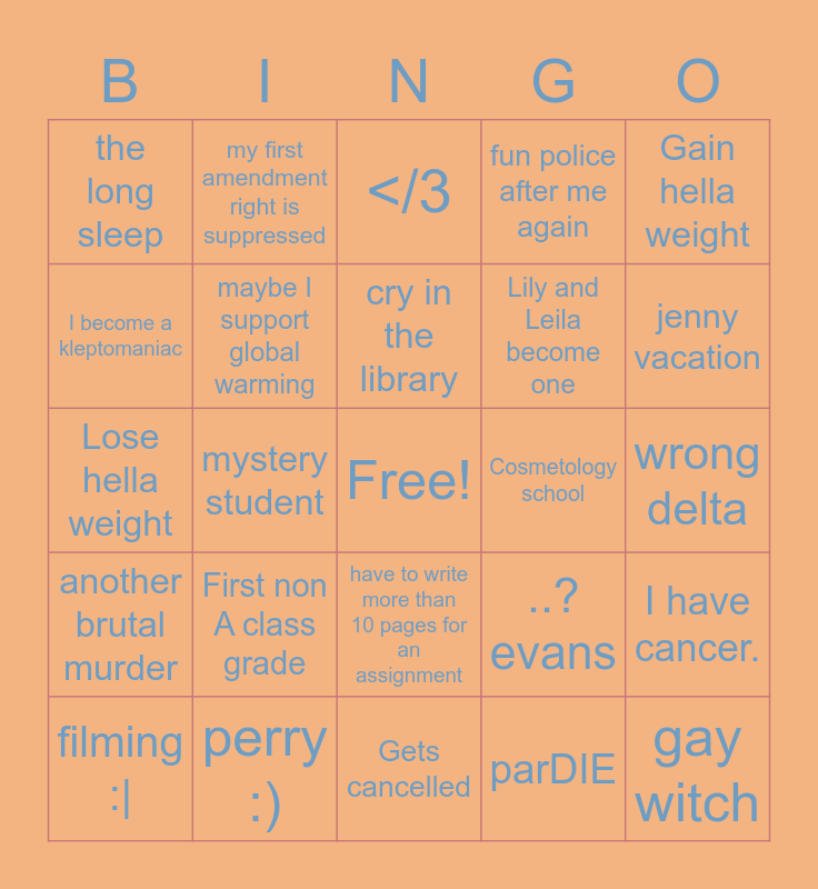This bingo card has a free space and 24 words: First non A class grade, perry :), cry in the library, filming :|, Gain hella weight, the long sleep, I become a kleptomaniac, my first amendment right is suppressed, Cosmetology school, have to write more than 10 pages for an assignment, Lily and Leila become one, Lose hella weight, ..?evans, I have cancer., maybe I support global warming, parDIE, wrong delta, </3, jenny vacation, mystery student, gay witch, another brutal murder, fun police after me again and Gets cancelled.