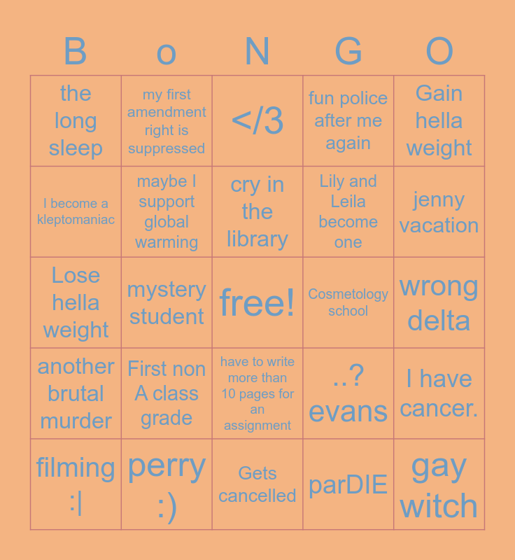 This bingo card has a free space and 24 words: First non A class grade, perry :), cry in the library, filming :|, Gain hella weight, the long sleep, I become a kleptomaniac, my first amendment right is suppressed, Cosmetology school, have to write more than 10 pages for an assignment, Lily and Leila become one, Lose hella weight, ..?evans, I have cancer., maybe I support global warming, parDIE, wrong delta, </3, jenny vacation, mystery student, gay witch, another brutal murder, fun police after me again and Gets cancelled.