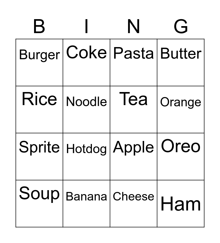 This bingo card has 16 words: Banana, Oreo, Pasta, Burger, Sprite, Coke, Apple, Cheese, Rice, Noodle, Soup, Butter, Hotdog, Orange, Tea and Ham.