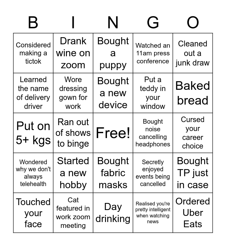 This bingo card has a free space and 24 words: Started a new hobby, Cat featured in work zoom meeting, Bought a new device, Touched your face, Cleaned out a junk draw, Considered making a tictok, Learned the name of delivery driver, Drank wine on zoom, Bought noise cancelling headphones, Bought fabric masks, Put a teddy in your window, Put on 5+ kgs, Secretly enjoyed events being cancelled, Bought TP just in case, Wore dressing gown for work, Realised you're pretty intelligent when watching news, Cursed your career choice, Bought a puppy, Baked bread, Ran out of shows to binge, Ordered Uber Eats, Wondered why we don't always telehealth, Watched an 11am press conference and Day drinking.