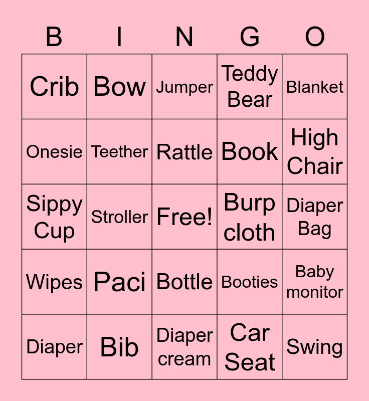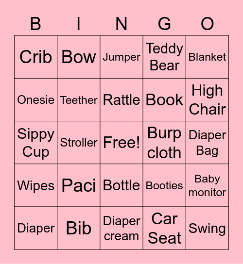 This bingo card has a free space and 24 words: Paci, Bib, Rattle, Diaper, Blanket, Crib, Onesie, Bow, Burp cloth, Bottle, Book, Sippy Cup, Booties, Baby monitor, Teether, Car Seat, Diaper Bag, Jumper, High Chair, Stroller, Swing, Wipes, Teddy Bear and Diaper cream.