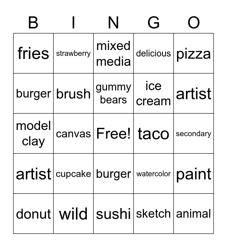 This bingo card has a free space and 25 words: cupcake, sushi, gummy bears, donut, pizza, fries, burger, strawberry, taco, burger, ice cream, model clay, watercolor, paint, brush, primary, secondary, mixed media, artist, canvas, animal, wild, artist, delicious and sketch.