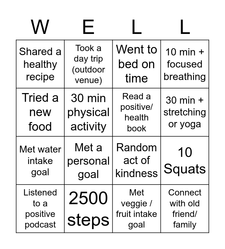 This bingo card has 16 words: 2500 steps, 10 Squats, Went to bed on time, Shared a healthy recipe, Met water intake goal, Took a day trip (outdoor venue), Random act of kindness, Met veggie / fruit intake goal, Tried a new food, 30 min physical activity, Listened to a positive podcast, 10 min + focused breathing, Met a personal goal, 30 min + stretching or yoga, Read a positive/ health book and Connect with old friend/ family.