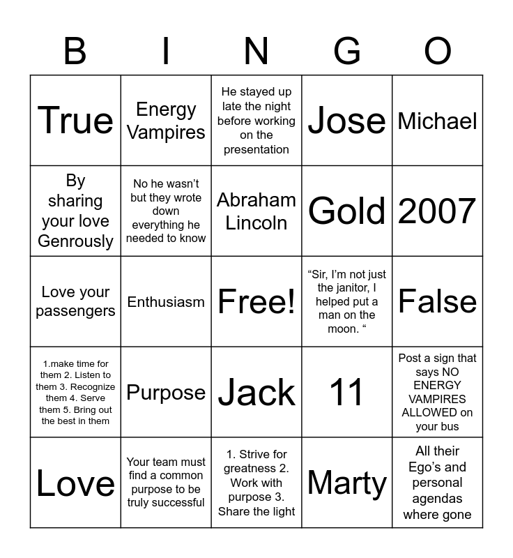 This bingo card has a free space and 29 words: Love, NO, Enthusiasm, Drive with purpose, True, He stayed up late the night before working on the presentation, No he wasn’t but they wrote down everything he needed to know, Purpose, “Sir, I’m not just the janitor, I helped put a man on the moon. “, Your team must find a common purpose to be truly successful, False, All their Ego’s and personal agendas where gone, 1. Strive for greatness 2. Work with purpose 3. Share the light, Marty, 2007, Self doubt, Jack, 1.make time for them 2. Listen to them 3. Recognize them 4. Serve them 5. Bring out the best in them, Michael, Love your passengers, 11, When you love someone you want what’s the best for them , help them discover the value inside them, Gold, By sharing your love Genrously, Jose, Energy Vampires, Post a sign that says NO ENERGY VAMPIRES ALLOWED on your bus, Abraham Lincoln and You’re the driver of your bus.