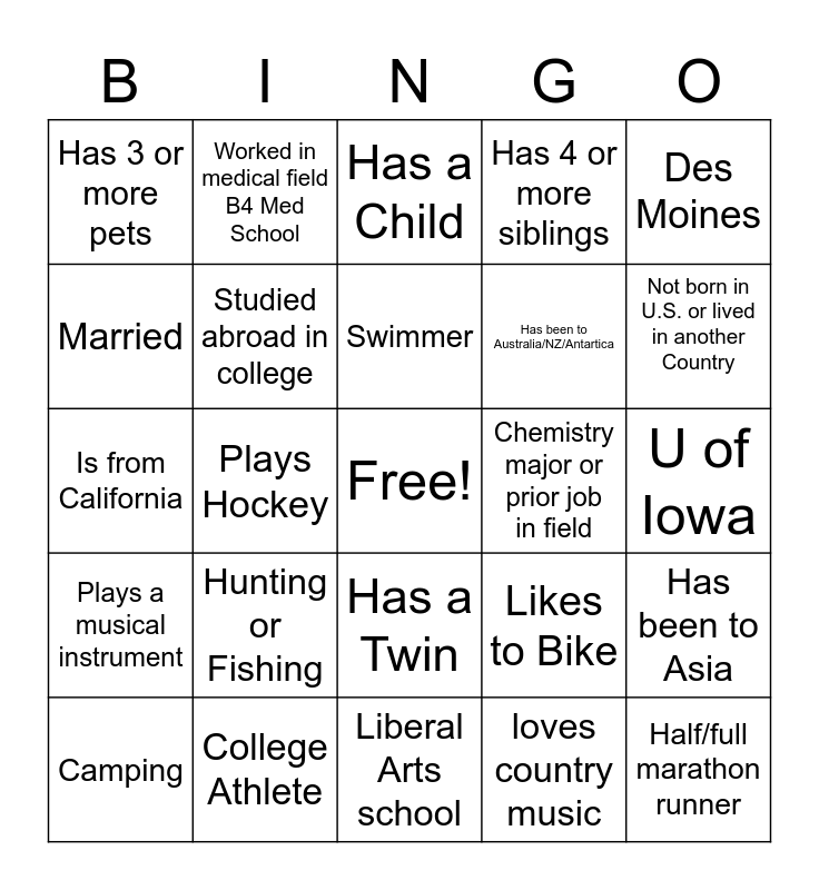 This bingo card has a free space and 35 words: Speaks a Second Language, Biology, Skydiver, Studied abroad in college, Has a Twin, Has 4 or more siblings, Married, Business major or prior job, Swimmer, Been to Europe, Is from California, Des Moines, Hiking, Non-trad student, Has 3 or more pets, Chemistry major or prior job in field, loves country music, Plays Hockey, Plays a musical instrument, Half/full marathon runner, Likes to Bike, Camping, Has been to Asia, College Athlete, Has a Child, Not born in U.S. or lived in another Country, Has Been to South America, Has been to Africa, Has been to Australia/NZ/Antartica, U of Iowa, Iowa State, Liberal Arts school, Hunting or Fishing, Worked in medical field B4 Med School and Loves Rock and Roll.