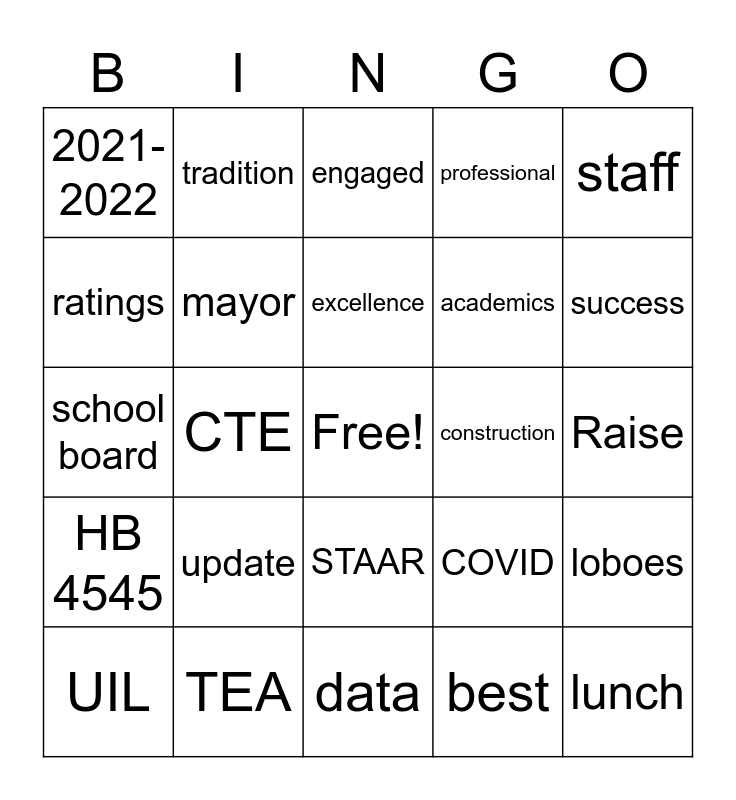 This bingo card has a free space and 29 words: UIL, rigor, CTE, MWP ISD, 2021-2022, engaged, mayor, update, construction, TEA, Raise, lunch, data, best, success, athletics, STAAR, HB 4545, staff, school board, COVID, behind, academics, ratings, professional, tradition, loboes, excellence and scores.
