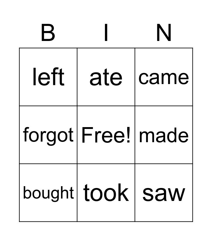 This bingo card has a free space and 9 words: bought, came, ate, forgot, left, made, saw, sold and took.