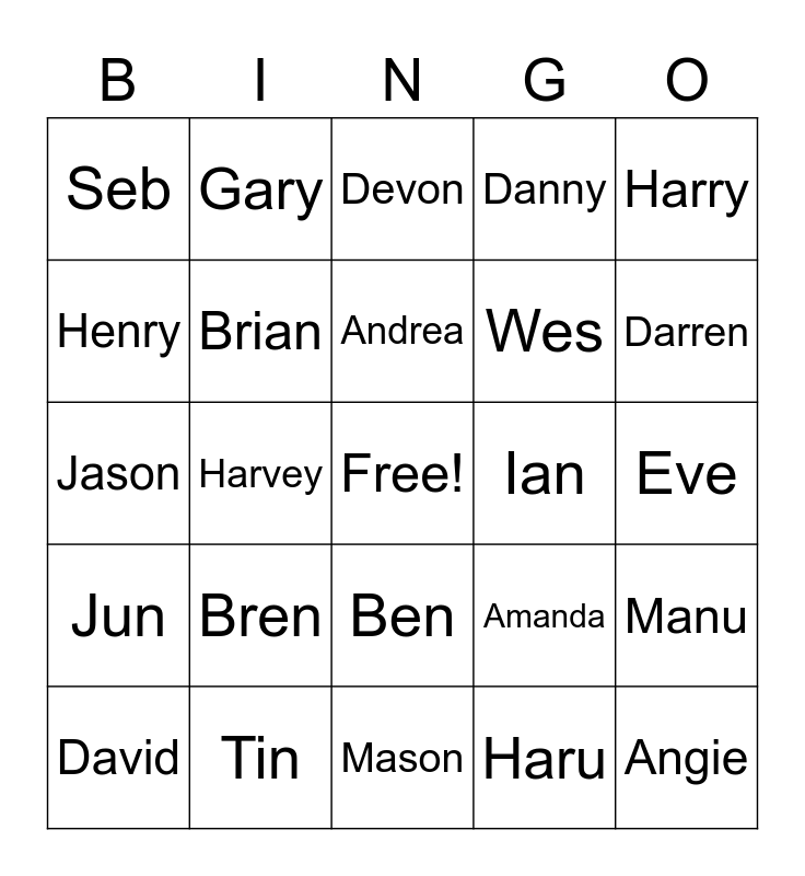 This bingo card has a free space and 24 words: David, Bren, Andrea, Haru, Harry, Seb, Gary, Devon, Ian, Eve, Jason, Brian, Amanda, Manu, Henry, Tin, Mason, Danny, Darren, Jun, Harvey, Ben, Wes and Angie.