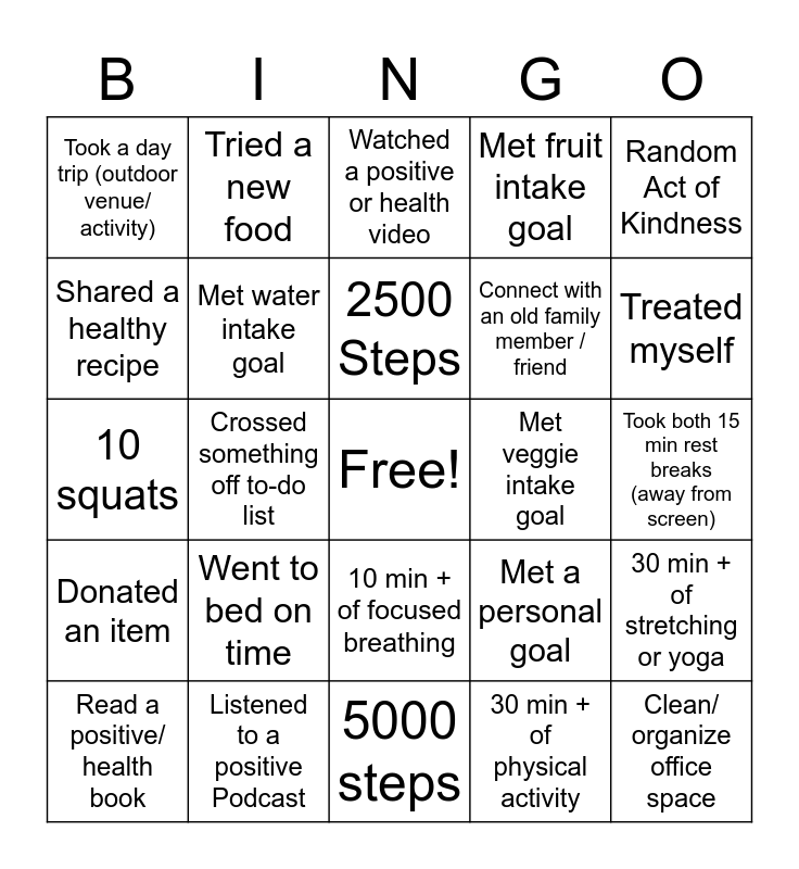 This bingo card has a free space and 24 words: Went to bed on time, Listened to a positive Podcast, 2500 Steps, Read a positive/ health book, Random Act of Kindness, Took a day trip (outdoor venue/ activity), Shared a healthy recipe, Tried a new food, Met veggie intake goal, 10 min + of focused breathing, Connect with an old family member / friend, 10 squats, Met a personal goal, 30 min + of stretching or yoga, Met water intake goal, 30 min + of physical activity, Took both 15 min rest breaks (away from screen), Watched a positive or health video, Treated myself, Crossed something off to-do list, Clean/ organize office space, Donated an item, Met fruit intake goal and 5000 steps.