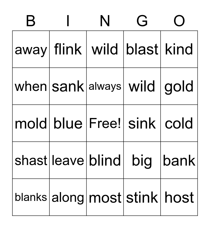 This bingo card has a free space and 24 words: leave, along, always, blanks, kind, away, when, flink, sink, blind, wild, mold, big, bank, sank, stink, cold, wild, gold, blue, host, shast, blast and most.