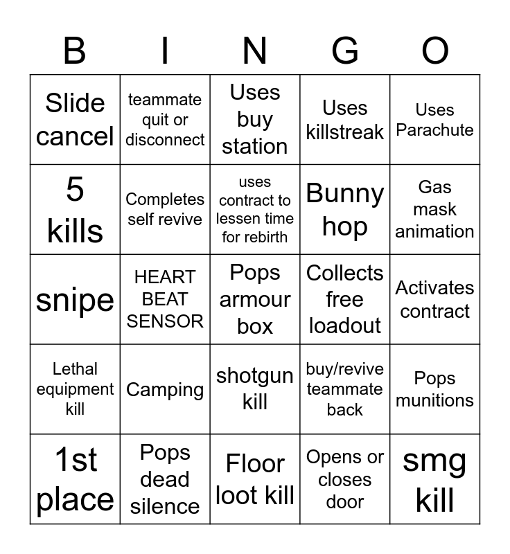 This bingo card has 25 words: Camping, Floor loot kill, uses contract to lessen time for rebirth, 1st place, Uses Parachute, Slide cancel, 5 kills, teammate quit or disconnect, Collects free loadout, shotgun kill, Bunny hop, snipe, buy/revive teammate back, Pops munitions, Completes self revive, smg kill, Activates contract, Uses buy station, Gas mask animation, HEART BEAT SENSOR, Pops armour box, Pops dead silence, Lethal equipment kill, Uses killstreak and Opens or closes door.