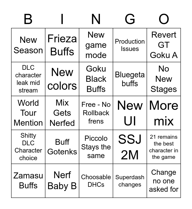 This bingo card has a free space and 24 words: Buff Gotenks, Nerf Baby B, Goku Black Buffs, Zamasu Buffs, Revert GT Goku A, New Season, DLC character leak mid stream, Frieza Buffs, New UI, Piccolo Stays the same, Bluegeta buffs, World Tour Mention, SSJ 2M, 21 remains the best character in the game, New colors, Superdash changes, More mix, New game mode, No New Stages, Mix Gets Nerfed, Change no one asked for, Shitty DLC Character choice, Production Issues and Choosable DHCs.