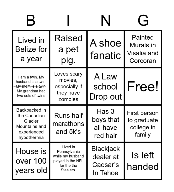 This bingo card has 1 images and 17 words: Blackjack dealer at Caesar’s In Tahoe, House is over 100 years old, A shoe fanatic, Lived in Belize for a year, Runs half marathons and 5k's, Painted Murals in Visalia and Corcoran, First person to graduate college in family, A Law school Drop out, Free!, Loves scary movies, especially if they have zombies, Lived in Pennsylvania while my husband played in the NFL for the the Steelers., Has 3 boys that all have red hair, I am a twin. My husband is a twin. My mom is a twin. My grandma had two sets of twins, Raised a pet pig., Backpacked in the Canadian Glacier Mountains and experienced hypothermia, Met his wife working at Baskin Robbins. and Is left handed.