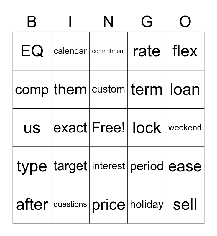 This bingo card has a free space and 24 words: after, target, custom, holiday, flex, EQ, calendar, commitment, lock, weekend, us, them, period, ease, comp, questions, price, rate, loan, type, exact, interest, term and sell.