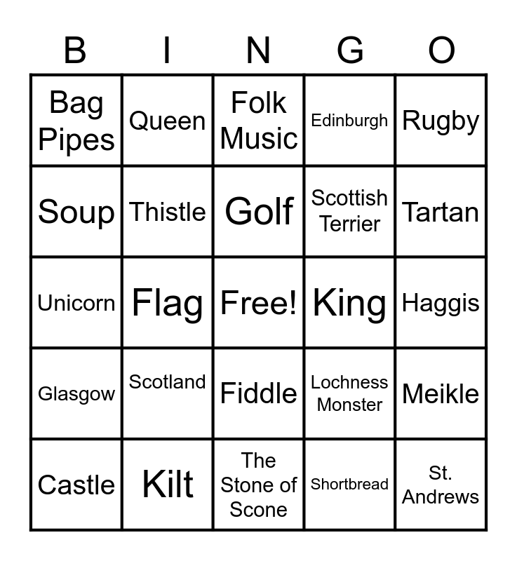 This bingo card has a free space and 24 words: Scotland, Kilt, Golf, Castle, Rugby, Bag Pipes, Soup, Queen, King, Fiddle, Scottish Terrier, Unicorn, Lochness Monster, Meikle, Thistle, Shortbread, Haggis, Folk Music, Tartan, Flag, St. Andrews, Glasgow, Edinburgh and The Stone of Scone.