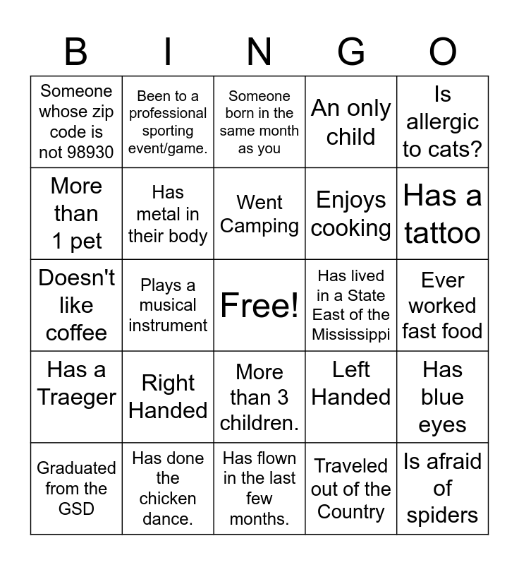 This bingo card has a free space and 24 words: Right Handed, Has done the chicken dance., Went Camping, Graduated from the GSD, Is allergic to cats?, Someone whose zip code is not 98930, More than 1 pet, Been to a professional sporting event/game., Has lived in a State East of the Mississippi, More than 3 children., Enjoys cooking, Doesn't like coffee, Left Handed, Has blue eyes, Has metal in their body, Traveled out of the Country, Ever worked fast food, Someone born in the same month as you, Has a tattoo, Plays a musical instrument, Is afraid of spiders, Has a Traeger, An only child and Has flown in the last few months..