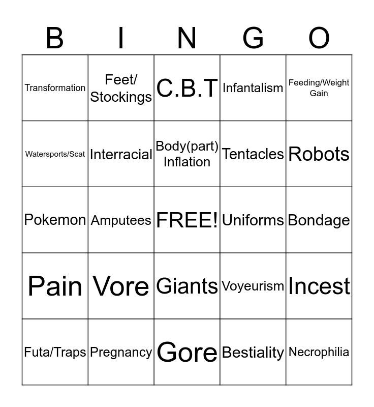 This bingo card has a free space and 24 words: Vore, Pregnancy, Body(part) Inflation, Futa/Traps, Feeding/Weight Gain, Transformation, Watersports/Scat, Feet/ Stockings, Uniforms, Giants, Tentacles, Pokemon, Voyeurism, Incest, Interracial, Bestiality, Bondage, C.B.T, Robots, Amputees, Necrophilia, Pain, Infantalism and Gore.
