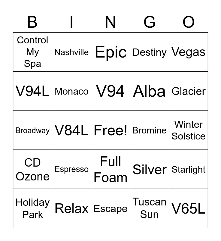 This bingo card has a free space and 76 words: Rendezvous, Summit, Epic, Euphoria, Microsilk, Jets, Waterfalls, Kona, Sport, Splash, Resort, Spirit, V94, V94L, V84, V84L, V77L, V65L, Woodstock, Vegas, Hollywood, Broadway, Monaco, Nashville, Destiny, Wish, Vortex, DuraWood, Granite, Timber, Driftwood, Cordovan, Barnwood, Silver, Glacier, Alba, Midnight Canyon, Oregon Sunset, Winter Solstice, Tuscan Sun, Regal, WhiteWater, Crown, Elite, Celebrity, E-Series, Holiday Park, Control My Spa, Cover Companion, Inline, Spa Frog, Full Foam, V150W, V150P, Constant Clean, Wi-fi, Motown, Adagio, Hi Flow, Hot Zone, Espresso, Ash, Walnut, Charcoal, Weathershield, Chlorine, Bromine, Twilight, Jewel, Constellation, Starlight, CD Ozone, Relax, Getaway, Escape and Renew.