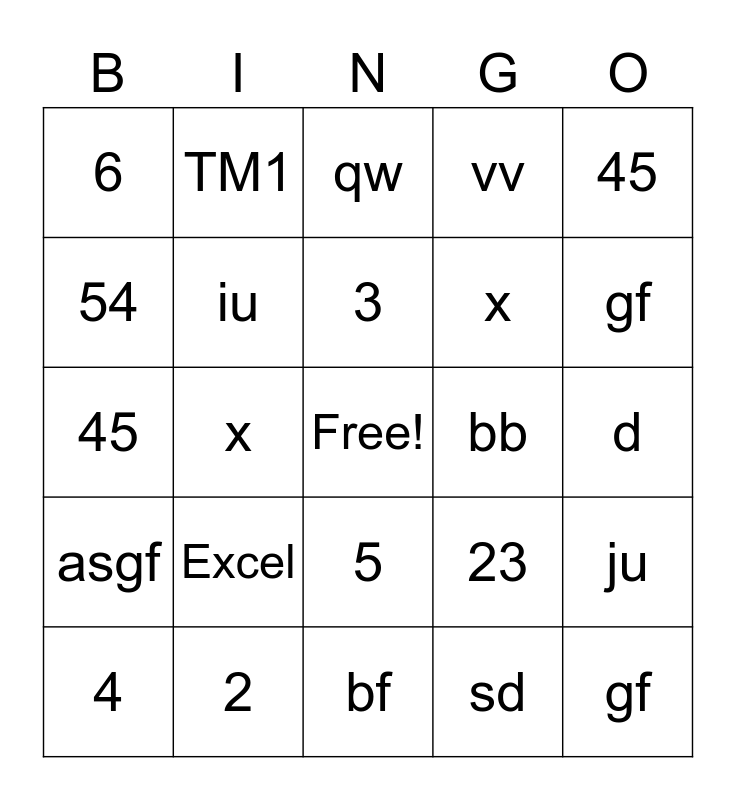 This bingo card has a free space and 24 words: Excel, 2, 3, 4, 45, 6, 54, TM1, bb, 5, x, 45, 23, ju, iu, sd, d, qw, gf, x, gf, asgf, vv and bf.