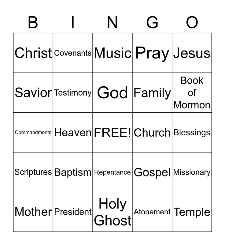 This bingo card has a free space and 38 words: Conference, Prophet, Son, Testimony, Missionary, Baptism, God, Joseph Smith, Jesus, Family, Heaven, Pray, Temple, Blessings, Savior, Scriptures, Love, Music, Faith, Church, Christ, President, Book of Mormon, Mother, Father, Holy Ghost, Home, Service, Children, Priesthood, Redeemer, Repentance, Atonement, Covenants, Ordinance, Gospel, Commandments and Easter.