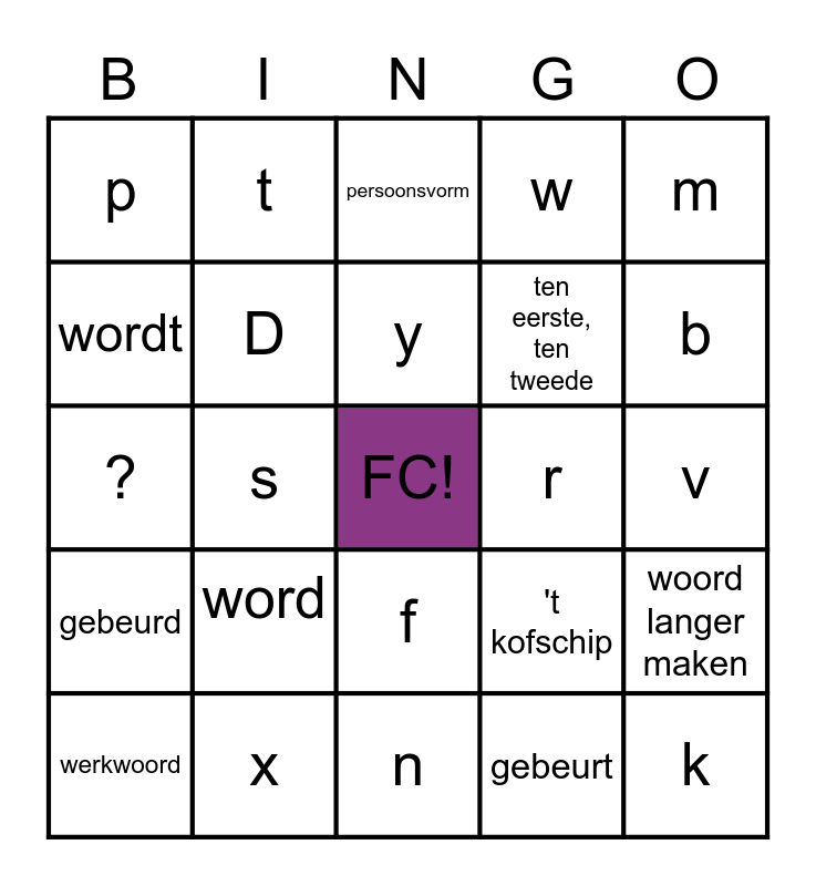This bingo card has a free space and 24 words: word, x, y, werkwoord, m, p, wordt, t, r, f, ten eerste, ten tweede, ?, 't kofschip, woord langer maken, D, gebeurt, v, persoonsvorm, b, s, k, gebeurd, w and n.