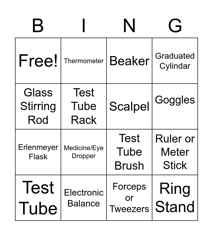 This bingo card has 16 words: Test Tube, Electronic Balance, Beaker, Graduated Cylindar, Glass Stirring Rod, Thermometer, Test Tube Brush, Ruler or Meter Stick, Free!, Test Tube Rack, Forceps or Tweezers, Goggles, Erlenmeyer Flask, Medicine/Eye Dropper, Scalpel and Ring Stand.