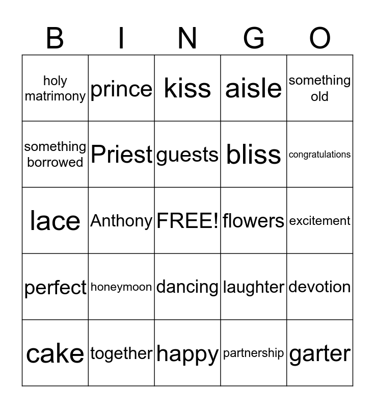 This bingo card has a free space and 76 words: Cinderella, champagne, kiss, memories, hug, I do!, 1st Dance, bouquet, husband, life, groom, bridesmaid, guests, something borrowed, gifts, Anthony, love, garter, maid of honour, something old, family, lace, Priest, prince, aisle, bride, loyalty, embrace, money, tuxedo, promises, romantic, cherish, laughter, congratulations, bliss, veil, adventure, excitement, partnership, heartfelt, union, couple, unconditional, elope, shower, cake, holy matrimony, gown, something new, wife, dancing, church, planning, reception, best man, princess, ring bearer, friends, wine, honeymoon, something blue, bells, florist, May 30, 2015, white, flowers, precious, commitment, doves, devotion, perfect, together, Jennifer, happy and heart.