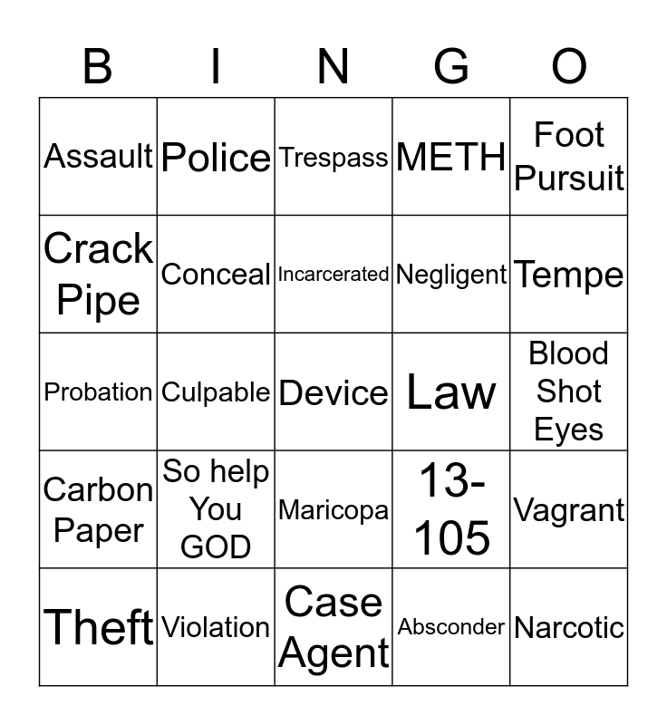 This bingo card has 25 words: So help You GOD, Case Agent, Incarcerated, Theft, Foot Pursuit, Assault, Crack Pipe, Police, Law, Maricopa, Negligent, Probation, 13-105, Vagrant, Conceal, Narcotic, Blood Shot Eyes, Trespass, Tempe, Culpable, Device, Violation, Carbon Paper, METH and Absconder.