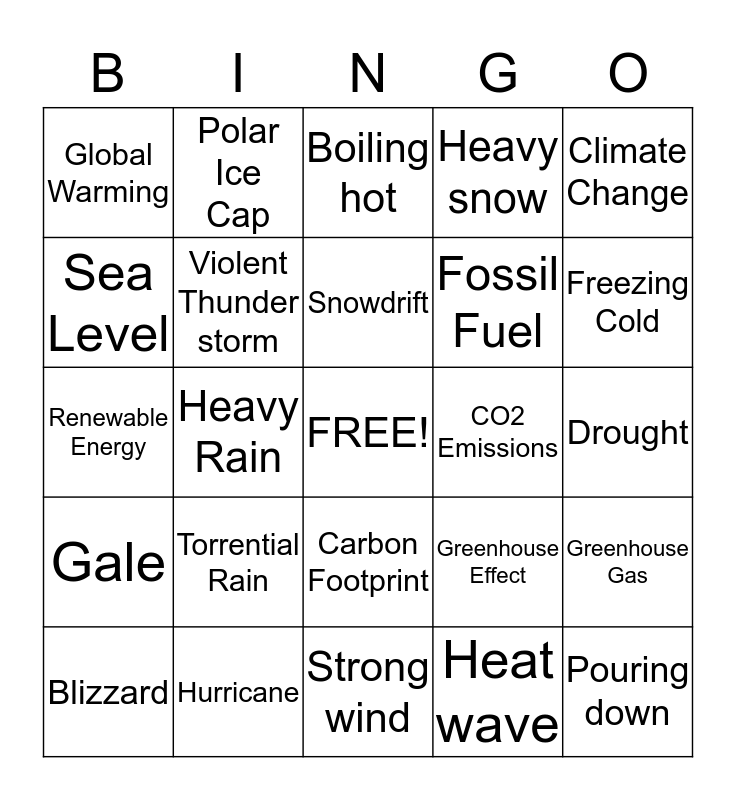 This bingo card has a free space and 24 words: Torrential Rain, Hurricane, Snowdrift, Blizzard, Climate Change, Global Warming, Sea Level, Polar Ice Cap, CO2 Emissions, Carbon Footprint, Fossil Fuel, Renewable Energy, Greenhouse Effect, Greenhouse Gas, Violent Thunder storm, Heat wave, Drought, Boiling hot, Freezing Cold, Heavy Rain, Pouring down, Gale, Heavy snow and Strong wind.