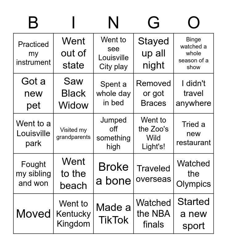 This bingo card has 25 words: Went to the beach, Made a TikTok, Spent a whole day in bed, Moved, Binge watched a whole season of a show, Practiced my instrument, Got a new pet, Went out of state, Went to the Zoo's Wild Light's!, Broke a bone, Removed or got Braces, Went to a Louisville park, Traveled overseas, Watched the Olympics, Saw Black Widow, Started a new sport, Tried a new restaurant, Went to see Louisville City play, I didn't travel anywhere, Visited my grandparents, Jumped off something high, Went to Kentucky Kingdom, Fought my sibling and won, Stayed up all night and Watched the NBA finals.