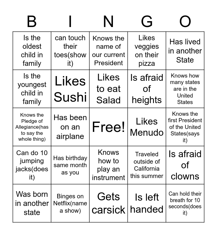 This bingo card has a free space and 24 words: Has birthday same month as you, Binges on Netflix(name a show), Likes to eat Salad, Was born in another state, Has lived in another State, Is the oldest child in family, Is the youngest child in family, can touch their toes(show it), Likes Menudo, Knows how to play an instrument, Is afraid of heights, Knows the Pledge of Allegiance(has to say the whole thing), Traveled outside of California this summer, Is afraid of clowns, Likes Sushi, Is left handed, Knows the first President of the United States(says it), Knows the name of our current President, Knows how many states are in the United States, Has been on an airplane, Can hold their breath for 10 seconds(does it), Can do 10 jumping jacks(does it), Likes veggies on their pizza and Gets carsick.