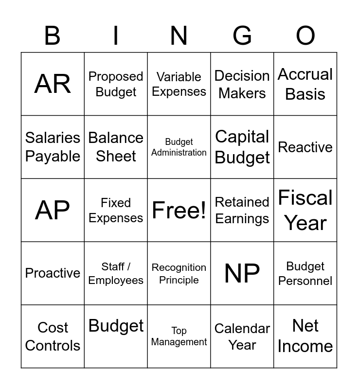This bingo card has a free space and 29 words: Cost Controls, Supervisors, Fixed Expenses, Cash, AR, Variable Expenses, Balance Sheet, Staff / Employees, Retained Earnings, Budget, Fiscal Year, Net Income, Top Management, Calendar Year, Reactive, GAAP, Recognition Principle, Proactive, Accrual Basis, AP, NP, Stock, Capital Budget, Salaries Payable, Decision Makers, Proposed Budget, Budget Personnel, Budget Administration and Strategic Plan.