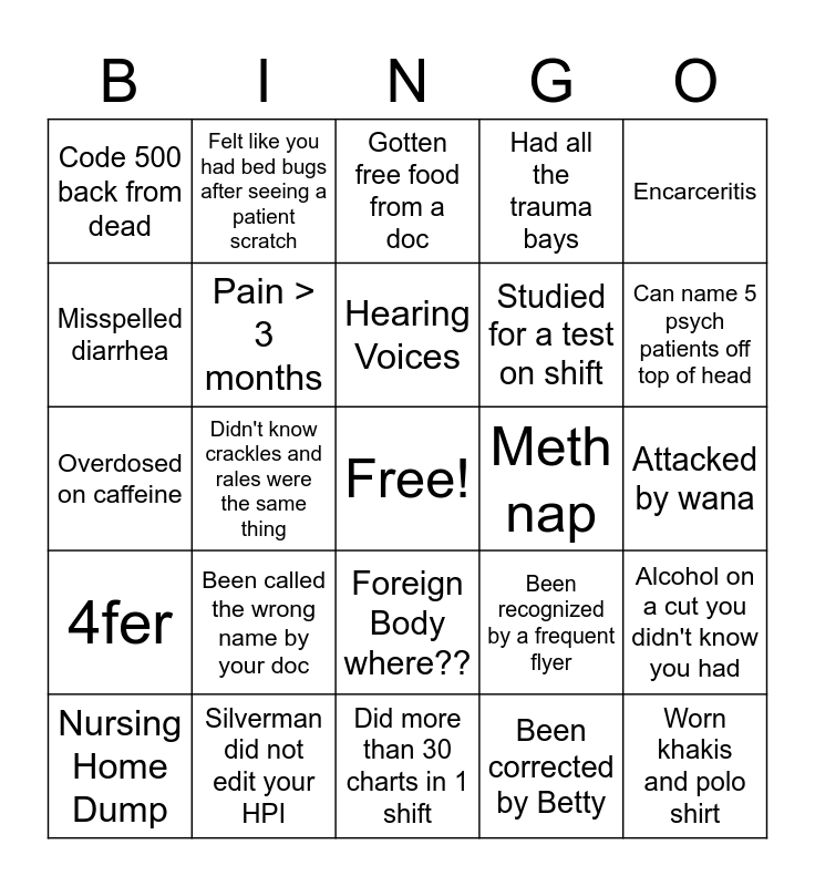 This bingo card has a free space and 24 words: Been called the wrong name by your doc, Silverman did not edit your HPI, Hearing Voices, Nursing Home Dump, Encarceritis, Code 500 back from dead, Misspelled diarrhea, Felt like you had bed bugs after seeing a patient scratch, Meth nap, Foreign Body where??, Studied for a test on shift, Overdosed on caffeine, Been recognized by a frequent flyer, Alcohol on a cut you didn't know you had, Pain > 3 months, Been corrected by Betty, Attacked by wana, Gotten free food from a doc, Can name 5 psych patients off top of head, Didn't know crackles and rales were the same thing, Worn khakis and polo shirt, 4fer, Had all the trauma bays and Did more than 30 charts in 1 shift.