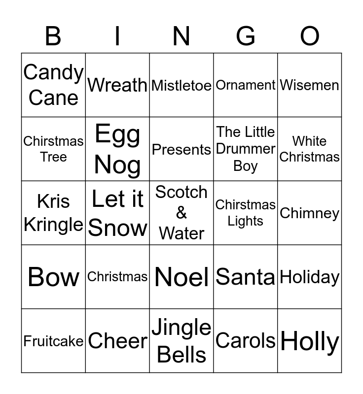This bingo card has a free space and 24 words: Christmas, Cheer, Presents, Fruitcake, Wisemen, Candy Cane, Chirstmas Tree, Wreath, Chirstmas Lights, Noel, The Little Drummer Boy, Kris Kringle, Santa, Holiday, Egg Nog, Carols, Chimney, Mistletoe, White Christmas, Let it Snow, Holly, Bow, Ornament and Jingle Bells.