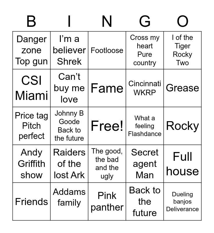 This bingo card has a free space and 60 words: The A- Team, Addams family, Air Wolf, Andy Griffith show, Back to the future, Bonanza, Can’t buy me love, Car wash, Cincinnati WKRP, Come on get happy The Partridge Family, Cross my heart Pure country, CSI Las Vegas, CSI Miami, CSI New York, Dancing Queen Mama Mia, Danger zone Top gun, Dueling banjos Deliverance, I of the Tiger Rocky Two, Fat Albert, Fame, What a feeling Flashdance, Footloose, Friends, Full house, George of the jungle, Ghostbusters, Gilligans island, Good old boys Dukes of Hazzard, Grease, Growing pains, Happy days, Hawaii Five-0, Heartland Pure country, Help I cross my heart Pure country, I’m a believer Shrek, James Bond 007, Jetsons, Johnny B Goode Back to the future, Knight Rider, Price tag Pitch perfect, Quantum leap, Raiders of the lost Ark, Rocky, Scooby Doo, Secret agent Man, September Night at the museum, Smokey and the bandit, Spiderman, Tequila Pee-wee‘s big adventure, The good, the bad and the ugly, Pink panther, Three stooges, Top gun, Twist and shout Ferris Bueller‘s Day off, Walker Texas Ranger, Welcome back Kotter, Where the sidewalk ends Pure country, Who’s the boss, X-Files and You can’t hurry love Runaway bride.