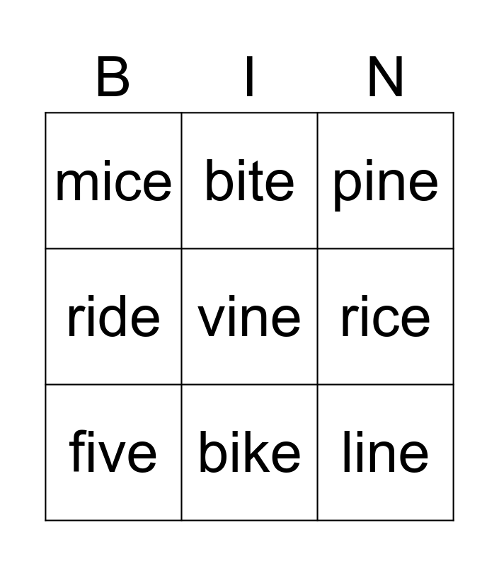 This bingo card has a free space and 15 words: ice, side, pine, mice, bike, line, dice, hike, rice, nine, kite, ride, five, bite and drive.