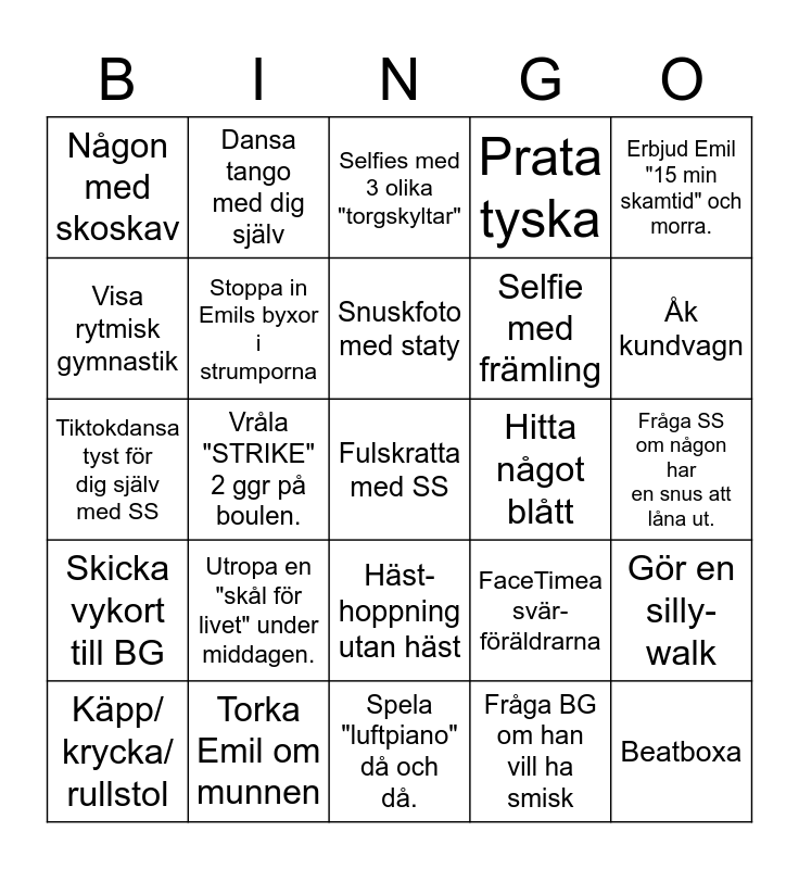 This bingo card has 25 words: Utropa en "skål för livet" under middagen., Spela "luftpiano" då och då., Snuskfoto med staty, Käpp/ krycka/ rullstol, Erbjud Emil "15 min skamtid" och morra., Någon med skoskav, Visa rytmisk gymnastik, Dansa tango med dig själv, Hitta något blått, Häst-hoppning utan häst, Selfie med främling, Tiktokdansa tyst för dig själv med SS, FaceTimea svär-föräldrarna, Gör en silly-walk, Stoppa in Emils byxor i strumporna, Beatboxa, Fråga SS om någon har en snus att låna ut., Selfies med 3 olika "torgskyltar", Åk kundvagn, Vråla "STRIKE" 2 ggr på boulen., Fulskratta med SS, Torka Emil om munnen, Skicka vykort till BG, Prata tyska and Fråga BG om han vill ha smisk.