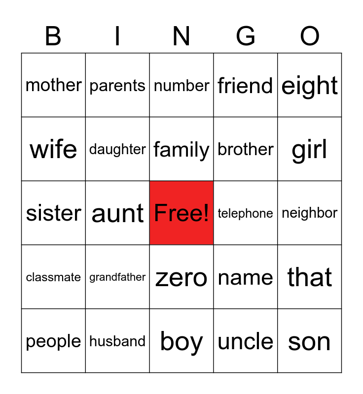 This bingo card has a free space and 24 words: grandfather, husband, family, people, eight, mother, wife, parents, telephone, zero, brother, sister, name, that, daughter, uncle, neighbor, number, girl, aunt, son, classmate, friend and boy.