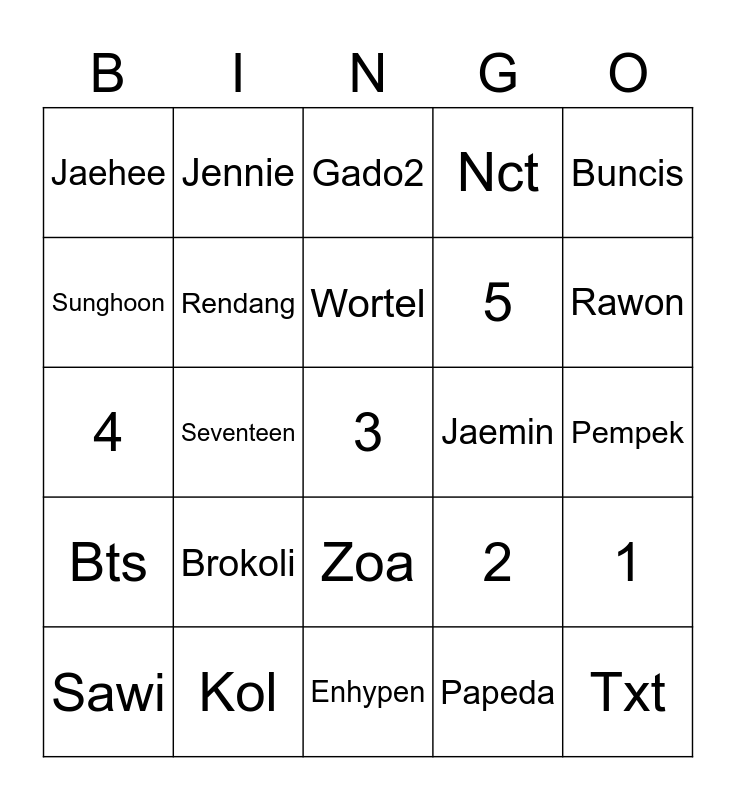 This bingo card has a free space and 24 words: Brokoli, Kol, Wortel, Sawi, Buncis, Jaehee, Sunghoon, Jennie, Jaemin, Zoa, 5, 4, 2, 1, Rendang, Papeda, Pempek, Gado2, Rawon, Seventeen, Txt, Bts, Nct and Enhypen.