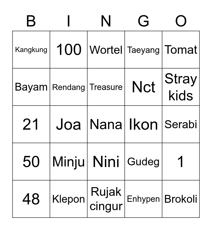 This bingo card has a free space and 24 words: Minju, Klepon, Treasure, 48, Tomat, Kangkung, Bayam, 100, Ikon, Nini, Nct, 21, Gudeg, 1, Rendang, Enhypen, Serabi, Wortel, Stray kids, Joa, Brokoli, 50, Taeyang and Rujak cingur.