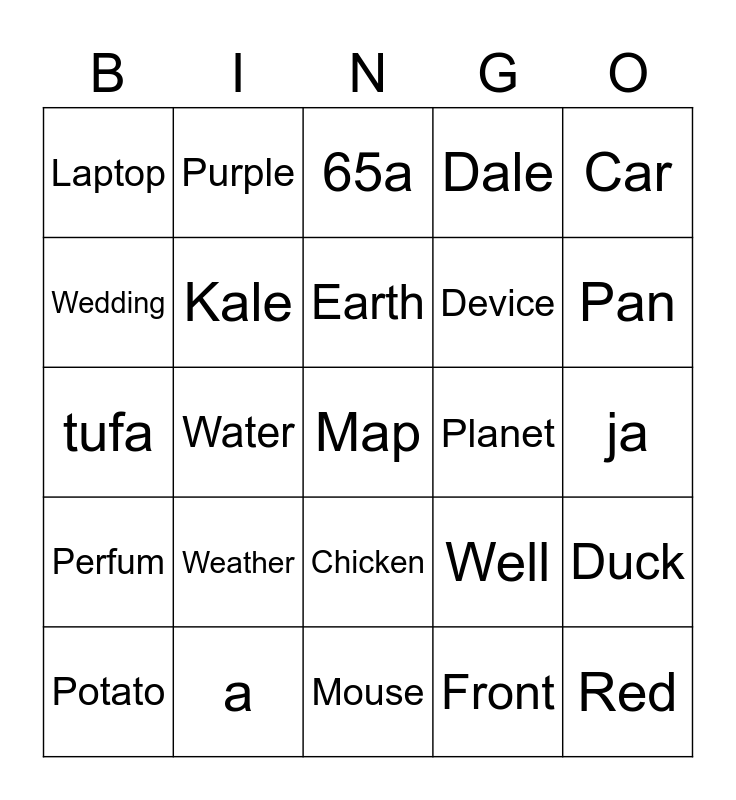 This bingo card has a free space and 49 words: Bread, Red, House, Mouse, Weather, Rain, Purple, FREE, Wedding, Country, Kale, Dale, Duck, Well, Down, Ground, Earth, Planet, Star, Car, Water, Front, Laptop, Device, Sauce, Pan, Potato, Apple, Chicken, Perfum, Food, Desert, Dessert, Card, a, aa, aaa, gha, ja, ztifa, 7a, 9ßpa, bga, pha, tufa, 65a, 0a, 56a and jiopa.