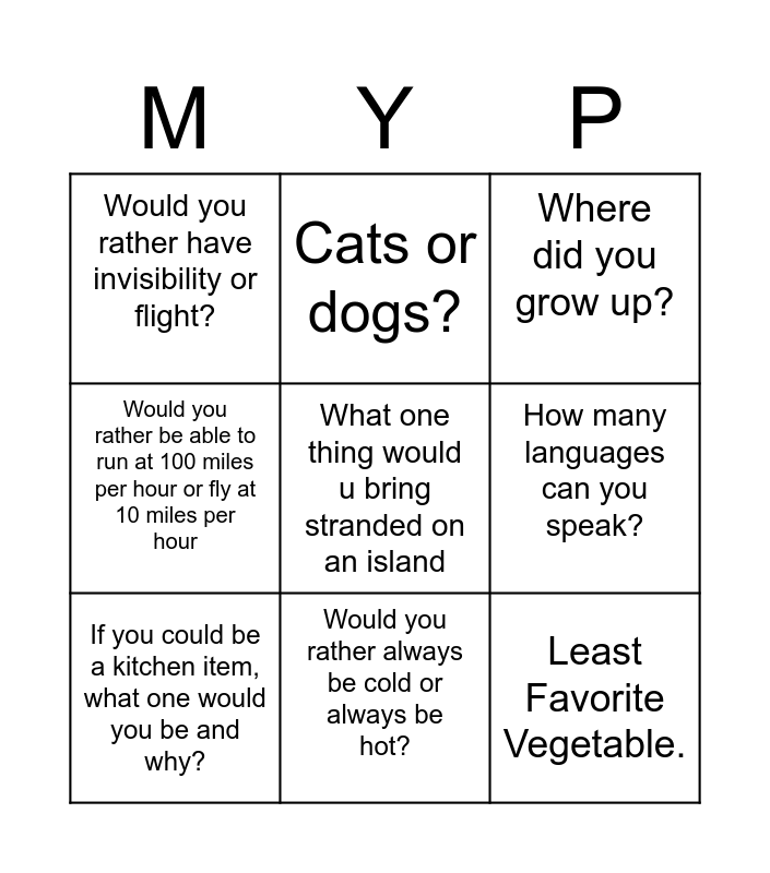 This bingo card has a free space and 8 words: How many languages can you speak?, Where did you grow up?, Cats or dogs?, If you could be a kitchen item, what one would you be and why?, Would you rather have invisibility or flight?, Least Favorite Vegetable., Would you rather be able to run at 100 miles per hour or fly at 10 miles per hour and Would you rather always be cold or always be hot?.